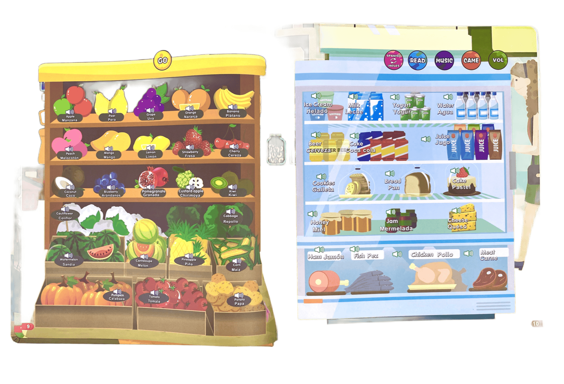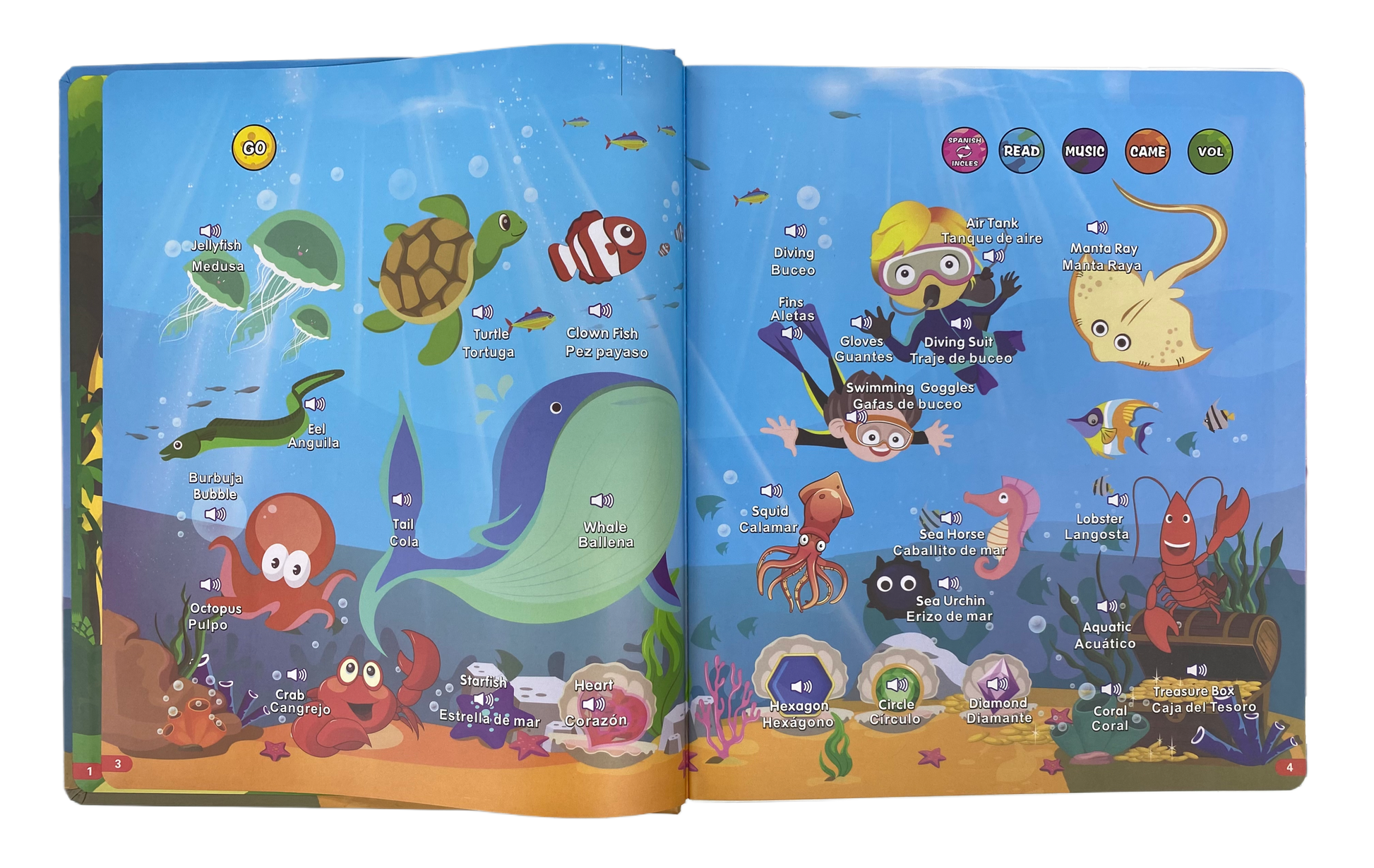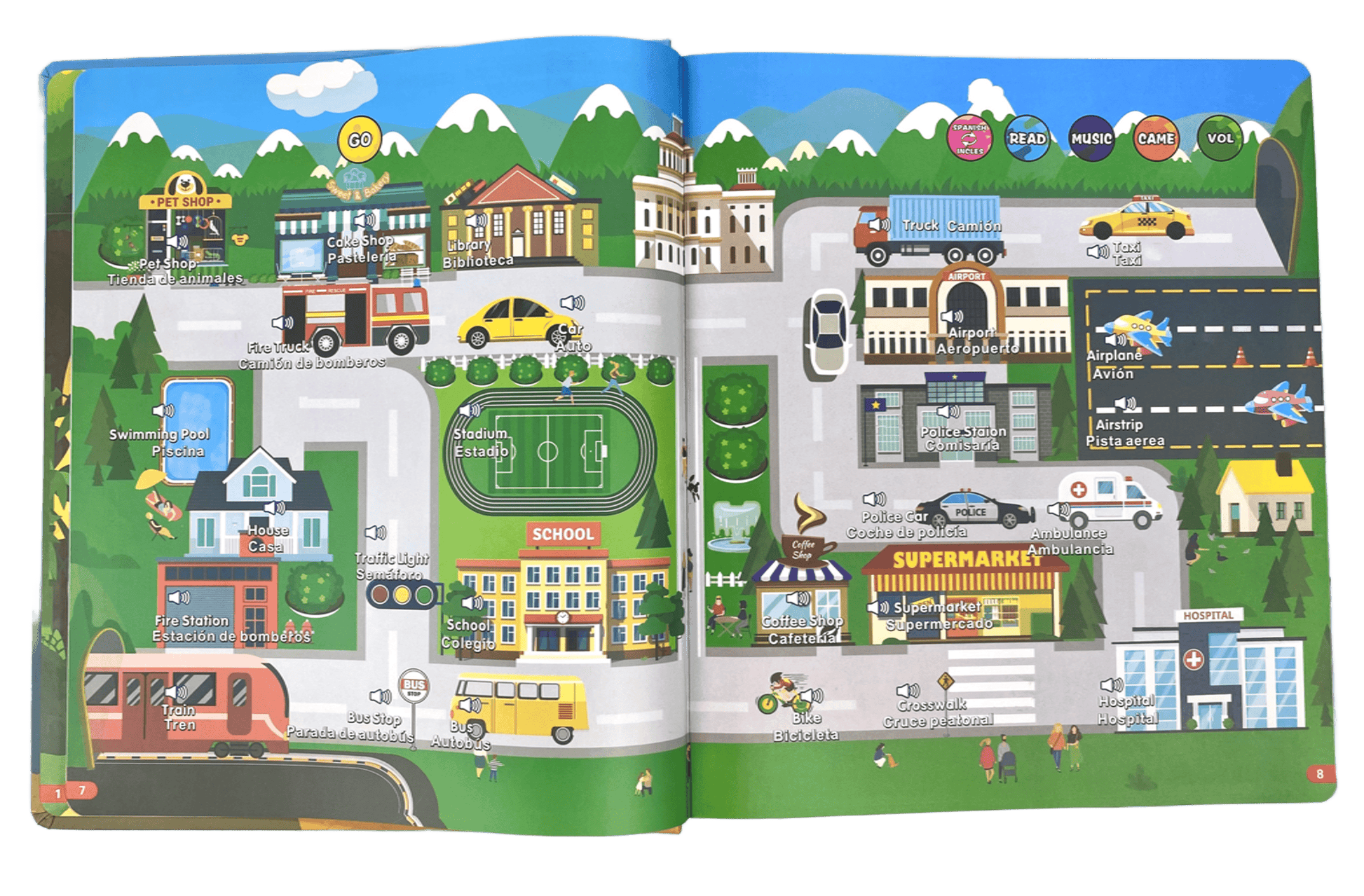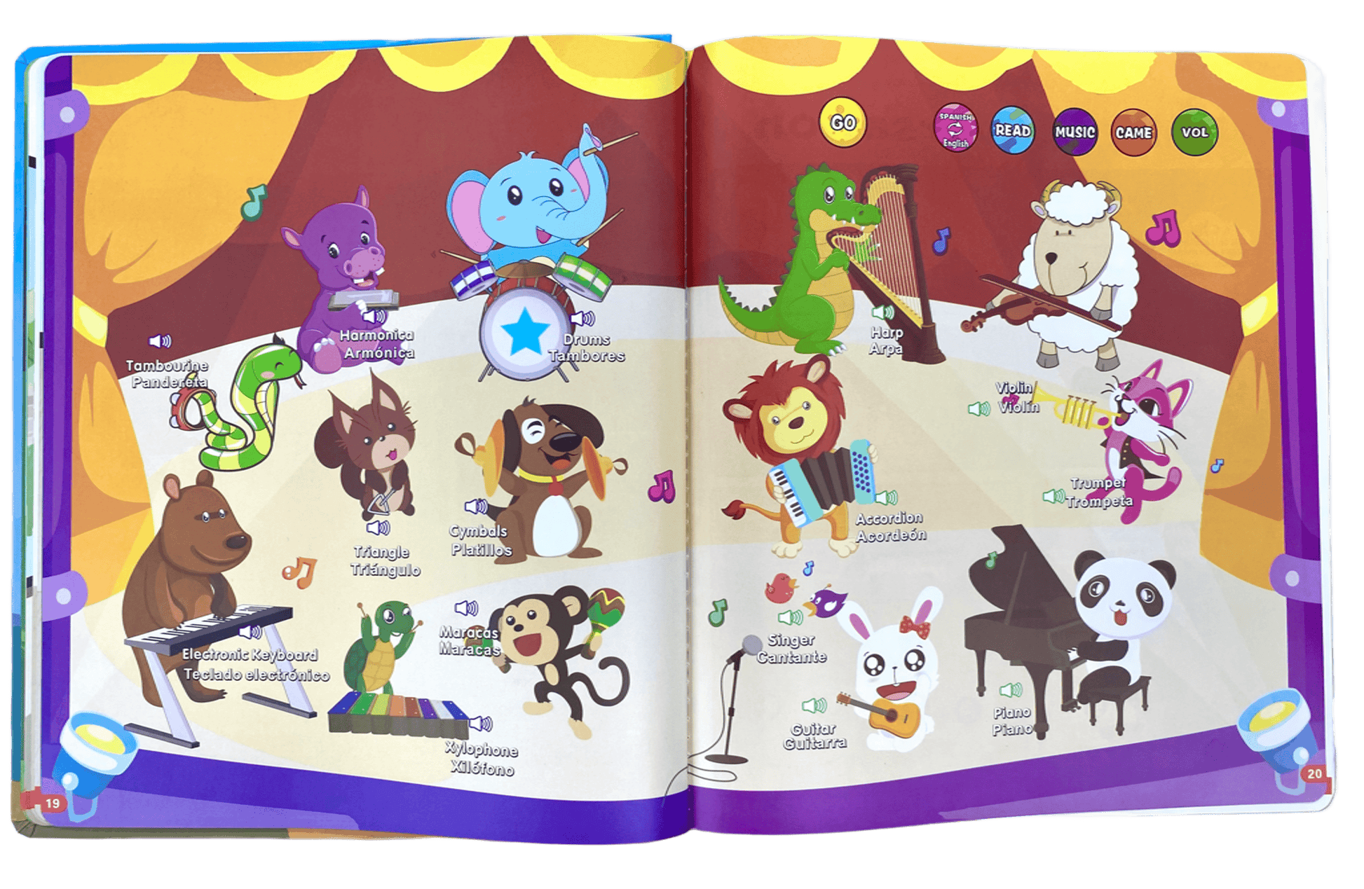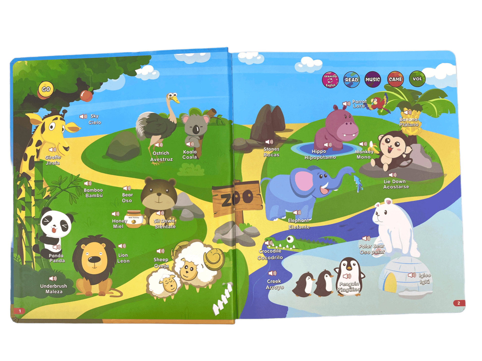 Este libro interactivo está diseñado para que tu pequeño aprenda nuevas palabras, sonidos y conceptos en español e inglés, mientras se divierte con más de 420 sonidos, música y juegos.